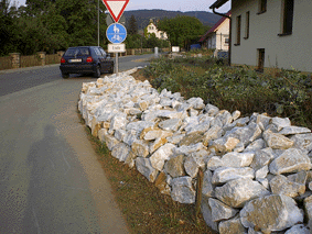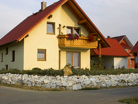 Hier sehen Sie unser Vorratslager für Bruchstein braun. Solche Steine werden für Trocken- oder Stützmauern verwendet. Die Steine sind witterungsunempfindlich, frostsicher und leicht zu bearbeiten. Ein Transport kann natürlich jederzeit durch unsere Lkw erfolgen. Als Beispiel eine Natursteintrockenmauer beim Neubau eines Wohnhauses in Scheßlitz bei Bamberg: |