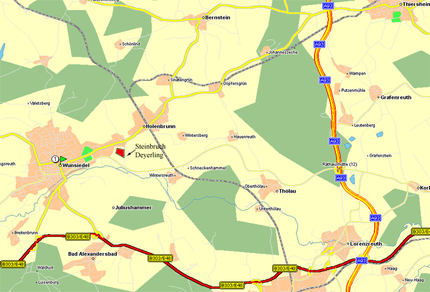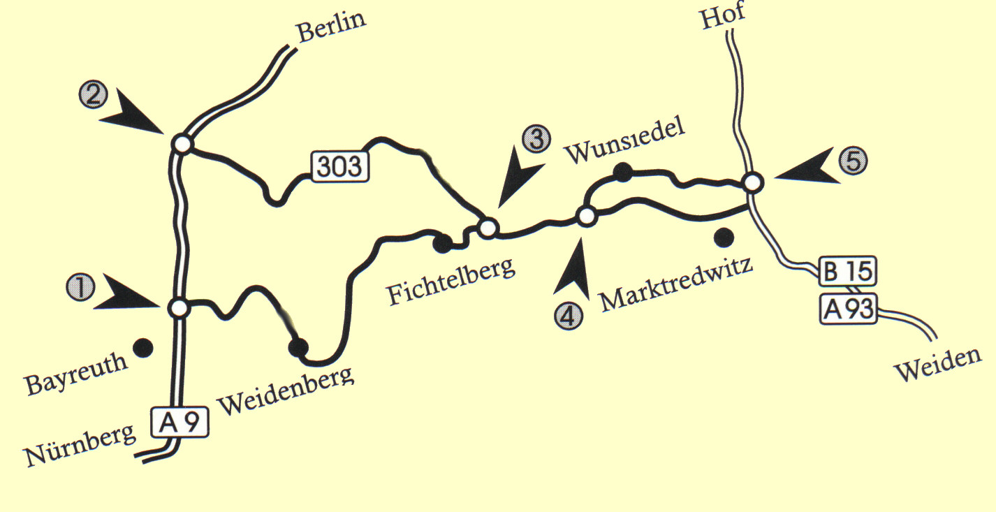 Wenn Sie von der BAB 9 kommen, nehmen Sie die Ausfahrt Bayreuth-Nord - Richtung Fichtelgebirge (1) und kommen so nach ca. 30km nach Fichtelberg, wo sich unser Büro befindet. Jetzt fahren Sie einfach weiter Richtung Wunsiedel (3), nehmen die 2. Abfahrt Wunsiedel - Luisenburg (4), Fahren in die Stadt - nach 500m links - an der 1. Ampel nach rechts bis zum Ortsausgang. Ca. 500m nach dem Ortsende an der Kläranlage links abbiegen, nach 200m befinden Sie sich direkt auf unserem Ausstellungsgelände beim Steinbruch. Sie können auf der BAB 9 auch die Ausfahrt Himmelkron - Wunsiedel abfahren (2) und von dort auf der B 303 direkt nach Wunsiedel gelangen. Wenn Sie von der BAB 93 kommen, nehmen Sie die Ausfahrt Wunsiedel - Seußen - Leutenberg - Rathaushütte und fahren ca. 3km Richtung Wunsiedel. Bei der Kläranlage rechts abbiegen. Nach 200m befinden Sie sich direkt auf unserem Ausstellungsgelände beim Steinbruch.